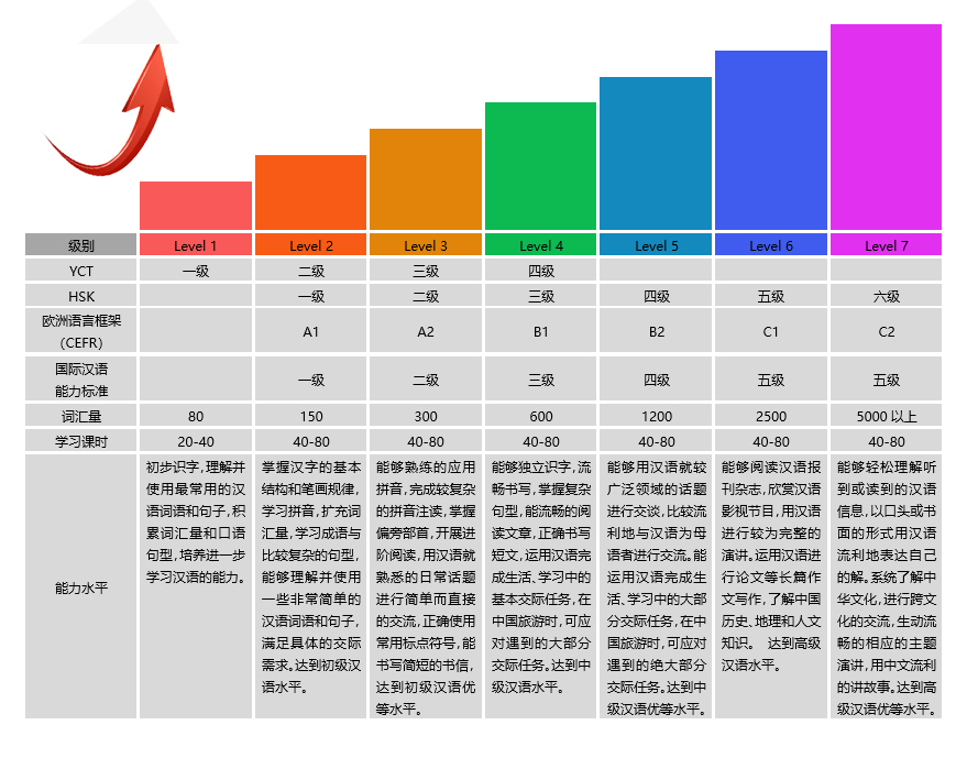 按照北京大学出版、专为海外华裔儿童设计的经典汉语教程标准,参照中国语文教学及欧洲语言框架,设置7级15个层次的汉语水平教学体系,涵盖儿童各个年龄段的中文学习需求,与YCT少儿汉语考试、HSK中文水平考试无缝对接。